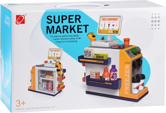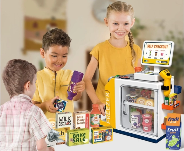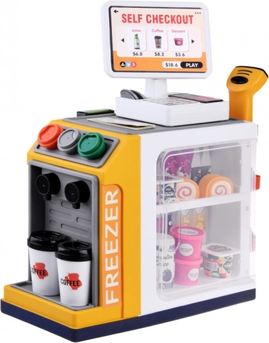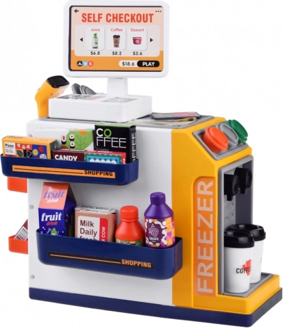 Šī reālistiskā pašapkalpošanās kase ar kafijas stūrīti pārvērtīs istabu mazā lielveikalā. Bērni var izmēģināt klientu apkalpošanu, kafijas pagatavošanu, preču skenēšanu un norēķinus ar karti vai “skaidrā naudā”. Integrētā saldētava/ledusskapis desertiem un dzērieniem, krāsainās pogas un displejs rada autentisku pieredzi.
