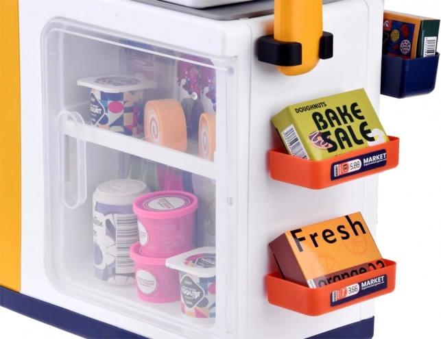 Aizveramā dzesēšanas daļa ietilpina jogurtus, sulas, desertus un citus pārtikas maketus. Ideāli spēlēm par kafejnīcu, veikalu un pašapkalpošanās kasi.