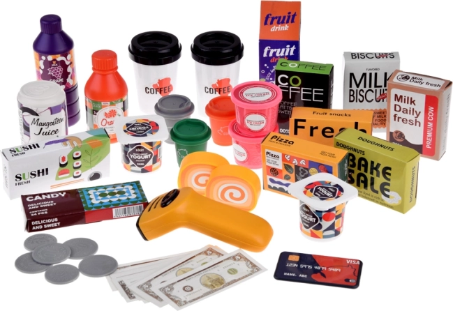 Komplektā iekļautas 46 rūpīgi izstrādātas sastāvdaļas: skaņas kases aparāts, skeneris ar gaismu, karšu lasītājs, kafijas un espresso krūzītes, dzērienu maketi, jogurti, saldējumi un papīra kastītes (piemēram, piens, cepumi, kafija, suši, pica u.c.), kā arī banknotes, monētas un kredītkarte. Tas veicina komunikāciju, sīko motoriku un finanšu pratību.
