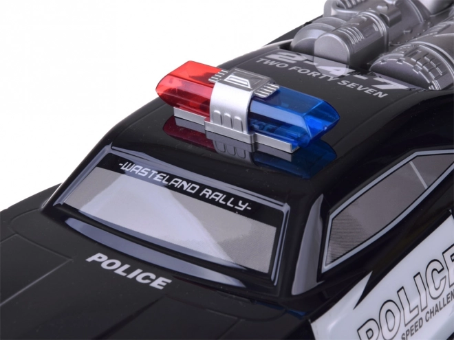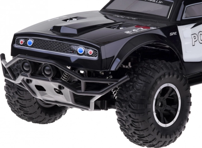 Monstru kravas auto izceļas ar robustu dizainu un izteiktiem policijas elementiem, tostarp sarkani-zilu apgaismojumu un uzrakstiem POLICE.