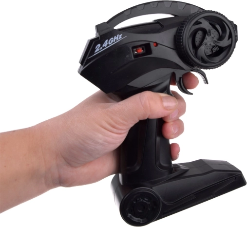 Tālvadība darbojas 2,4 GHz frekvencē, kas nodrošina stabilu savienojumu un precīzu automašīnas vadību.