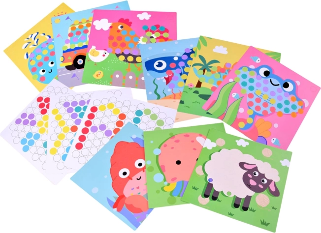 Komplektā ir 10 attēlu šabloni un 5 rakstu paraugi. Bērni var salikt dzīvniekus un transportlīdzekļus vai veidot savas mozaīkas.