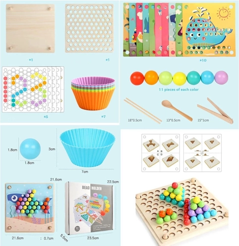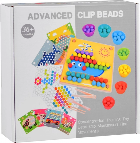 Šī koka mozaīka piedāvā 77 krāsainas lodītes 7 krāsās, divdaļīgu koka pamatni un bagātīgu piederumu komplektu, tostarp silikona bļodiņas, pinceti, kociņus un karotīti. Bērni var veidot motīvus no 10 tematiskajiem šabloniem (piem., krabis, astoņkājis, haizivs, raja, valis, gailis, aitiņa, govs, dinozaurs, autobuss) un 5 rakstu šabloniem – vai radīt pēc savas fantāzijas.