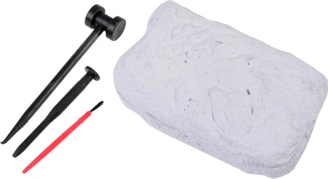 Komplektā ietilpst ģipša “klints”, āmuriņš, kalts un otiņa rūpīgai putekļu un sīku gabaliņu notīrīšanai. Atliek tikai noklāt darba virsmu, viegli samitrināt virsmu un sākt atklāt. Lieliska dāvanu ideja mazajiem ģeologiem un paleontologiem.