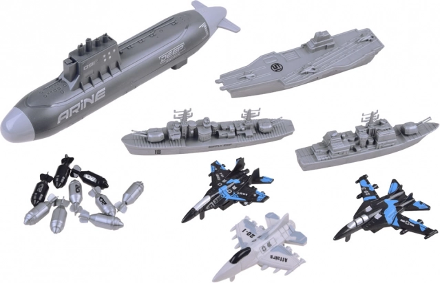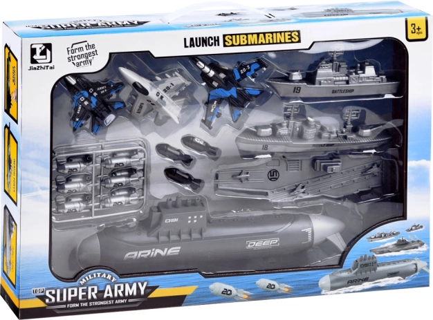 Šis visaptverošais militārās tehnikas komplekts iepazīstina bērnus ar jūras operācijām un gaisa atbalstu. Pateicoties zemūdenes, kuģu un iznīcinātāju kombinācijai, viņi var veidot savus scenārijus, plānot stratēģijas un attīstīt iztēli. Reālistiskas formas, atturīgas krāsas un apdrukas pastiprina jūras kaujas noskaņu.