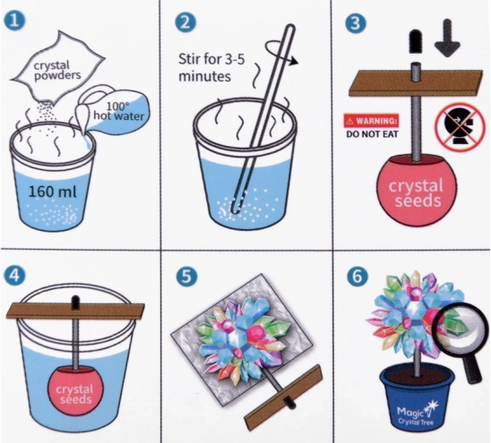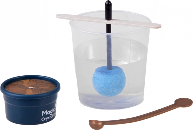 Komplektā ir viss nepieciešamais: 200 ml mērcilindrs, paciņa ar kristālu pulveri/smilti, krāsaina kristālu sēkliņa uz kociņa, maisāmais kociņš, lupa detalizētiem novērojumiem, koka plāksnīte, fiksators un mazs podiņš (pamatne). Process ir vienkāršs un drošs – pietiek ievērot instrukciju un strādāt ar karstu ūdeni pie pieaugušā uzraudzības.