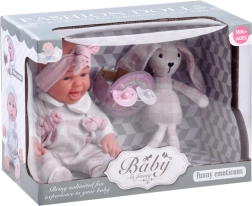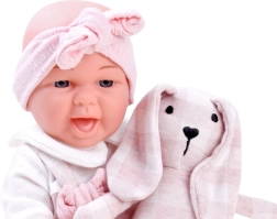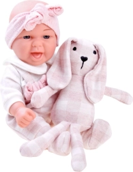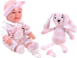 Šis mīļais zīdainītis ir tērpts baltrozā komplektā ar maigu matu stīpiņu, krekliņu, kas savienots ar rūtiņu šortiņiem, un baltām zeķītēm. Komplektā ietilpst arī mīksts plīša trusītis ar izšūtām actiņām un deguntiņu un divi knupīši (balts un rozā). Viss saskaņots maigos rozā–baltos toņos, kas rada maigu un tīru iespaidu.