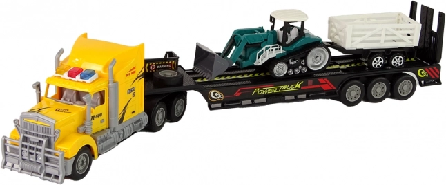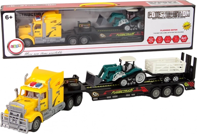- Reālistisks komplekts: kravas auto, puspiekabe, kāpurķēžu ekskavators un piekabe
