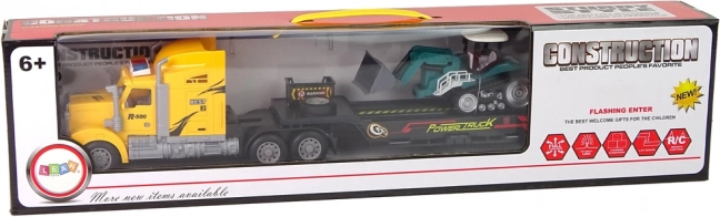 - kravas auto ar R/C pulti, puspiekabe, kāpurķēžu ekskavators, piekabe, lādētājs, dāvanu iepakojums ar lodziņu