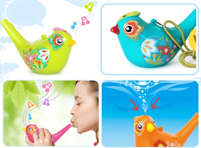 Mīlīga plastmasas svilpe putna formā, kas, pievienojot ūdeni, izdod dažādus toņus. Pateicoties košiem rotājumiem un vienkāršai lietošanai, tā sniedz bērniem daudz jautrības un attīsta muzikālo dzirdi un elpu.