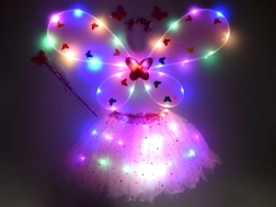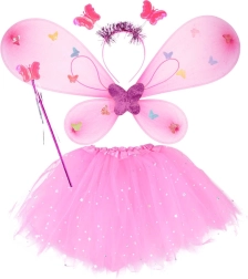 Šis maiga stila fejiņas kostīms izceļas ar gaiši rozā toni un rotaļīgām tauriņu rotām. Tilla tutu svārki ar elastīgu jostu ir pārkaisīti ar smalkiem mirdzumiem, tauriņu spārnus rotā krāsaini tauriņi, bet visu burvību noslēdz LED gaismiņas skaistam efektam arī krēslā.