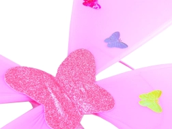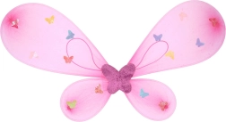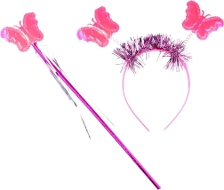 Gaiši rozā spārnus ar krāsainiem tauriņiem papildina saskaņota nūjiņa un matu stīpiņa – viss vienotā fejiņas stilā.