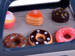 Izvietojiet kūkas, bageti un bulciņu, pagatavojiet kafiju ar krūzītēm un vāciņiem. Komplektā ir monētas, banknotes un maksājumu karte, lai apkalpošana būtu īpaši reālistiska.