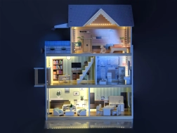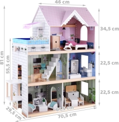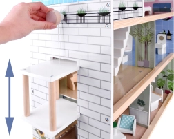 Šī brīnišķīgā leļļu mājiņa piedāvā reālistisku un stilīgu dizainu, kas apburs ikvienu bērnu. Mājiņai ir trīs stāvi ar detalizēti aprīkotām telpām: guļamistaba, viesistaba, vannas istaba, virtuve un dienas istaba. Pārvietojamais lifts un stilīgais terases baseins palielina pievilcību un nodrošina vietu radošai spēlei.