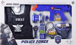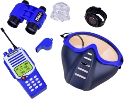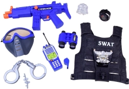 Šis bagātīgi aprīkotais policijas komplekts zilā–melnā krāsā pārvērtīs katru spēli aizraujošā piedzīvojumā. Bērni uzvelk plastmasas SWAT vesti un ar rācijas, tālskata un nozīmītes palīdzību kļūst par kārtības sargiem. Komplekts radīts drošai un radošai spēlei, lieliski piemērots karnevālam, teātra uzvedumiem un ikdienas izklaidei.