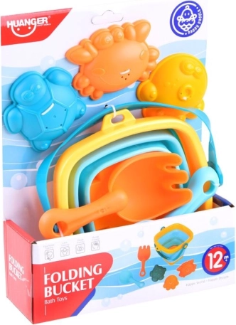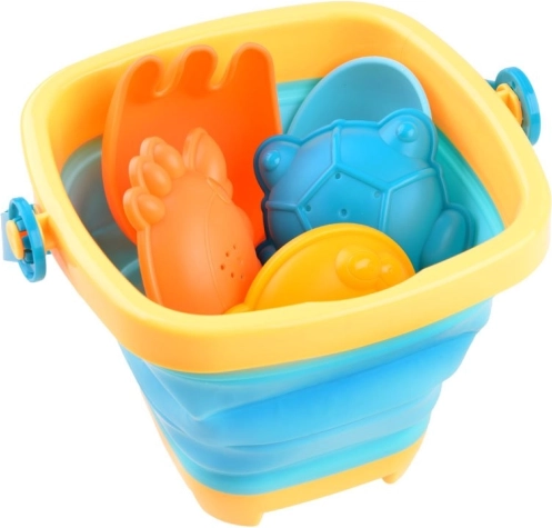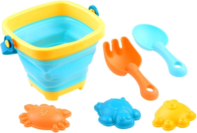 Ietver visu, kas bērniem nepieciešams radošai spēlei smiltīs: salokāmu spaini, lāpstiņu, grābekli un trīs formiņas.