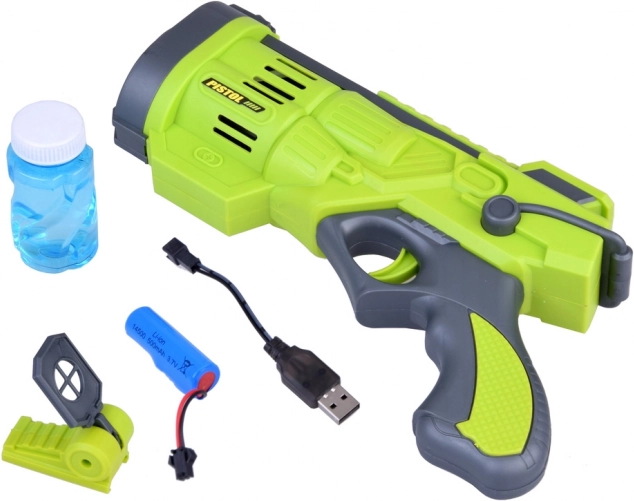 Komplektā ietilpst uzlādējams 500 mAh (3,7 V) akumulators un USB kabelis, tāpēc nav nepieciešams iegādāties baterijas. Noņemamais “tēmēklis” piešķir spēlei odziņu un palīdz virzīt burbuļu plūsmu tieši tur, kur vēlaties – ideāli bērnu ballītēm, piknikiem un ģimenes pasākumiem.