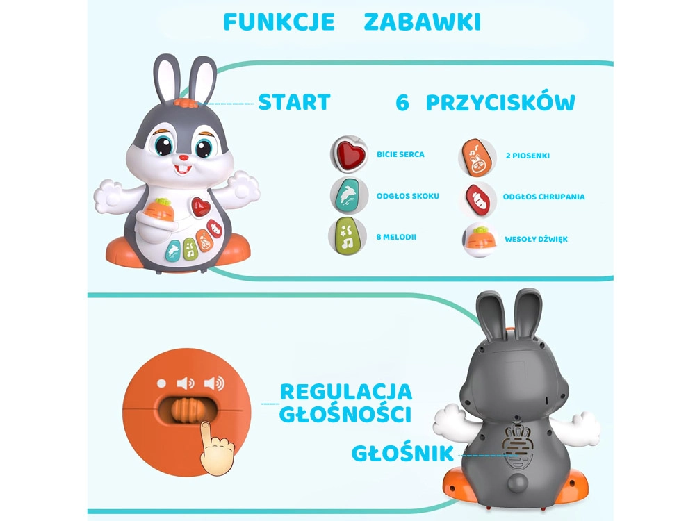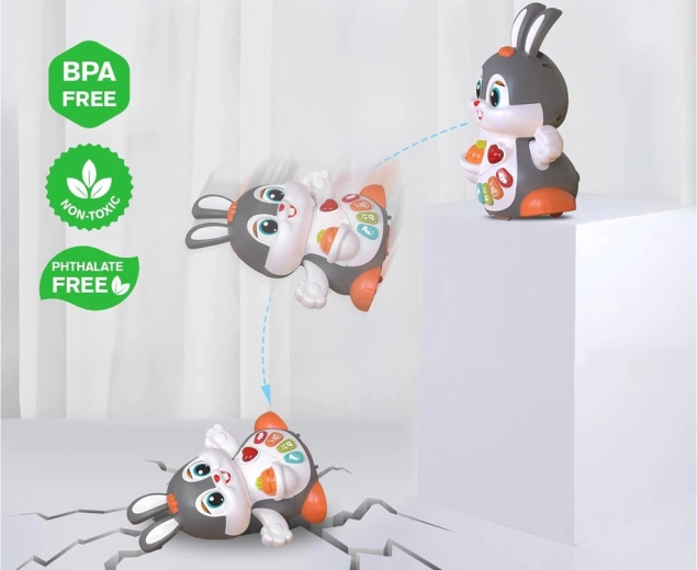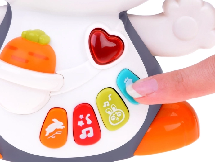 Krāsainās pogas aktivizē dažādas melodijas un skaņas (sirds puksti, lēkāšana, burkāna grauzšana), kuras pavada mirgojošas gaismiņas – ideāli sensorajai stimulācijai.