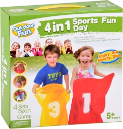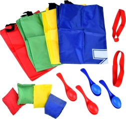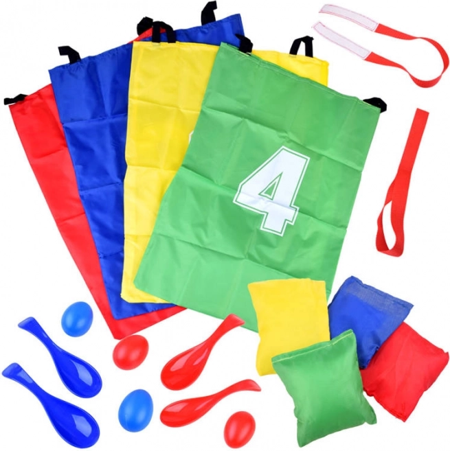 - 4 spēles 1 komplektā: lēkšana maisā, ola uz karotes, spilventiņa mešana, skrējiens pārī