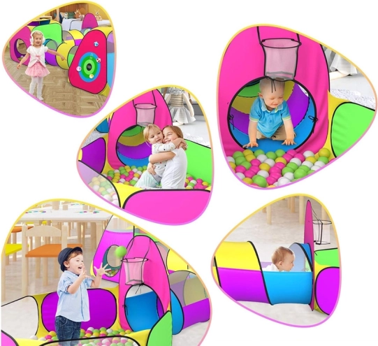 Katra telts piedāvā atšķirīgas aktivitātes: trīsstūrveida telts ar mērķi un caurumiem bumbiņu mešanai ar lipekli, kvadrātveida telts ar divām ieejām un iespēju pievienot tuneļus, kā arī telts – baseins/manēža, kas ideāli piemērota sausajam bumbiņu baseinam (bumbiņas nav iekļautas komplektā). Krāsainie paneļi un sietveida daļas veicina vizuālo stimulāciju un pieaugušo uzraudzību.