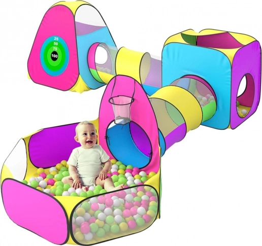 Izveidojiet bērniem savu spēļu pasauli ar šo universālo 5‑vienā telšu un tuneļu komplektu. Apvienojiet līdz pieciem elementiem dažādās konfigurācijās stundām ilgiem radošiem, kustību un sensorajiem piedzīvojumiem. Komplekts ir saliekams, viegls pārnēsāšanai un piemērots spēlēm mājās un dārzā. Iekļauts mērķa šķīvis bumbiņu mešanai ar lipekli, baseins/rotaļu manēža bumbiņām un vienkārša savienošana ar tuneļiem.