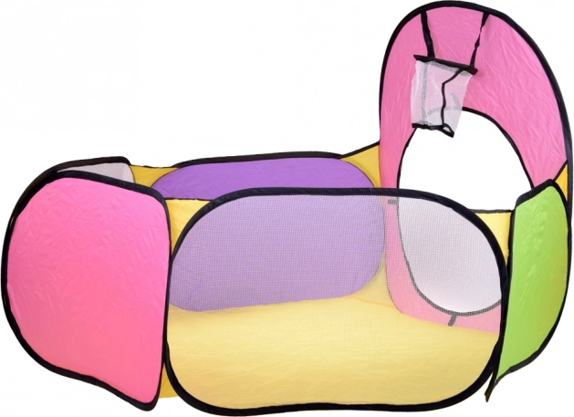 Modulārais bērnu centrs 5‑vienā piedāvā bezgalīgas iespējas. Trīs krāsainas teltis un divi elastīgi tuneļi brīvi savienojami un pārbūvējami – no neliela ložņu stūrīša līdz pat lielam gigantiskam spēļu laukumam vairāk nekā četru metru garumā. Pateicoties pop‑up konstrukcijai, salikšana aizņem tikai mirkli, bet pēc spēlēm visu vienkārši ielokiet pievienotajā somā.