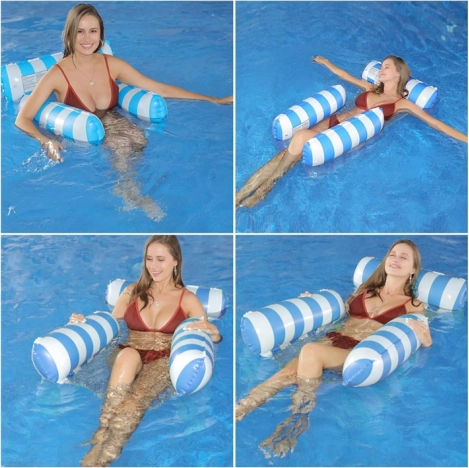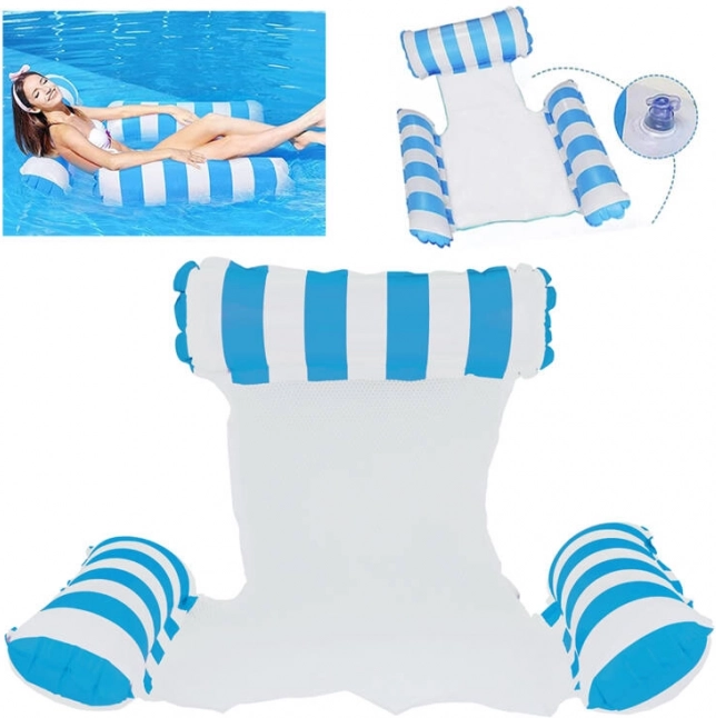 Aizmirstiet par parastajiem peldošajiem matračiem un izvēlieties unikālu risinājumu – hamoka stila matraci, kas ideāli piemērots karstām vasaras dienām. Tas ir veidots tā, lai ļautu daļēji iegremdēties ūdenī, tādējādi sauļošanās laikā vienmēr saglabājot patīkamu vēsumu. Matracis aprīkots ar piepūšamām daļām no izturīga PVC un savienots ar neilona sietu maksimālam komfortam. Tā elegantais zilbaltais dizains kļūs par jūsu brīvdienu fotoattēlu rotu.