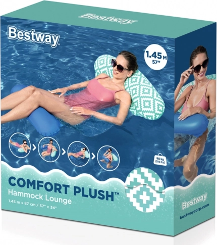 Bestway Comfort Plush ir stilīgs un ērts peldošs šūpuļtīkls, kas apvieno samtaini maigu virsmu ar elpojošu sietu. CoolDown guļamzona notur jūsu ķermeni tieši zem ūdens virsmas, lai karstumā saglabātu patīkamu svaigumu. Saskarē ar ūdeni raksta krāsas izceļas vēl spilgtāk.