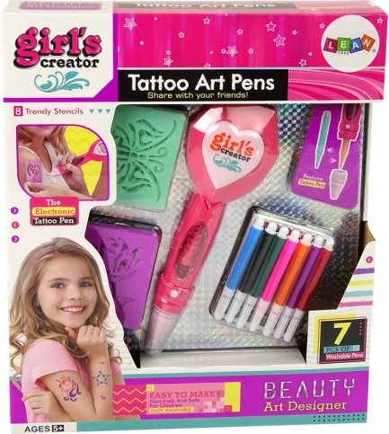 Atklājiet lielisku izklaidi bērniem no 5 gadu vecuma – pagaidu tetovējumu komplekts ar elektronisko pildspalvu, kas reāli atdarina tetovēšanas mašīnas darbību. Pateicoties speciālajiem marķieriem, tetovējumi ir droži ādai un viegli nomazgājami, tāpēc bērni var baudīt jaunus motīvus katru dienu.