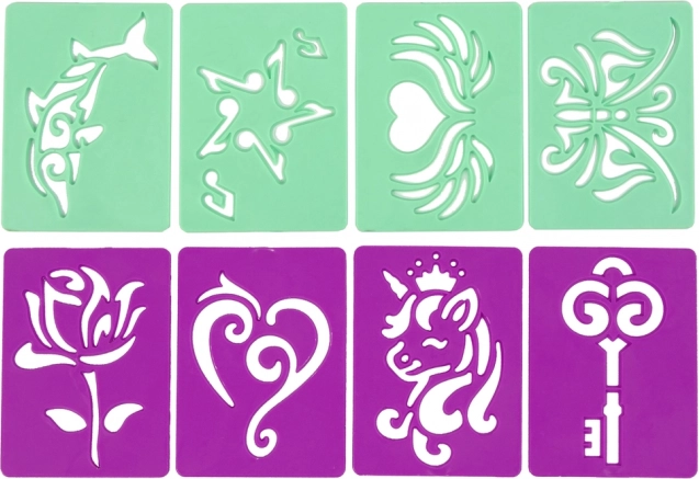 Vienkārši izvēlieties iemīļotu šablona motīvu, izvēlieties krāsu un sāciet radīt. Komplekts ir ideāls bērnu ballītēm, pēcpusdienām ar draugiem un radošām nodarbēm mājās – tas attīsta sīko motoriku un mākslinieciskās prasmes.