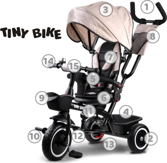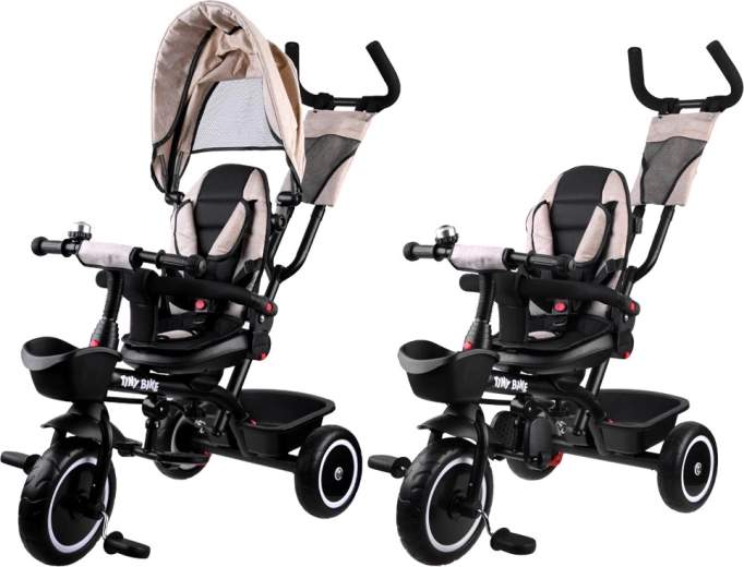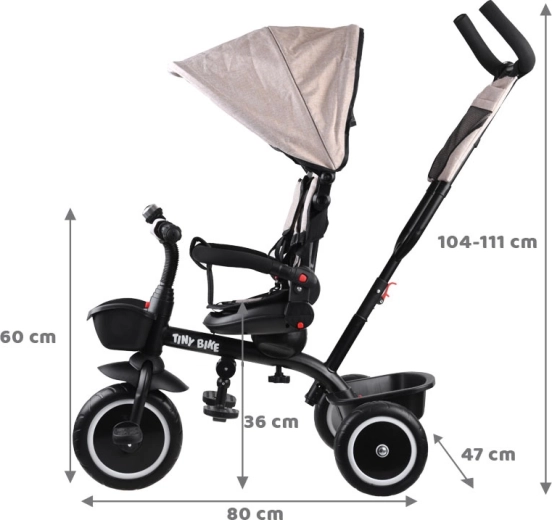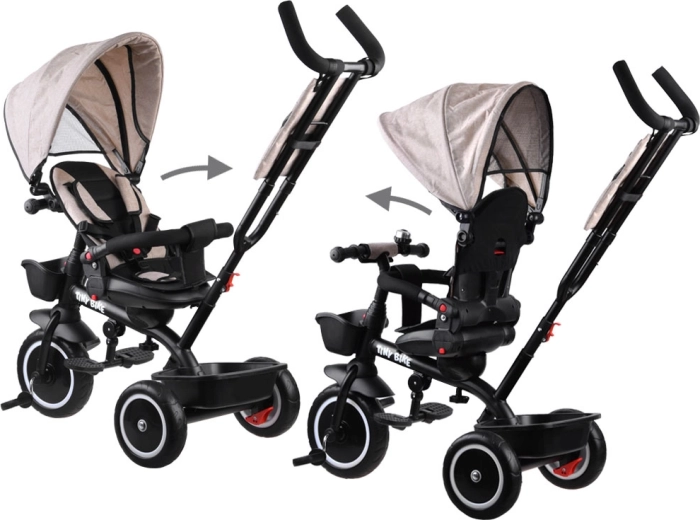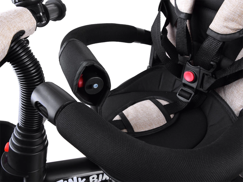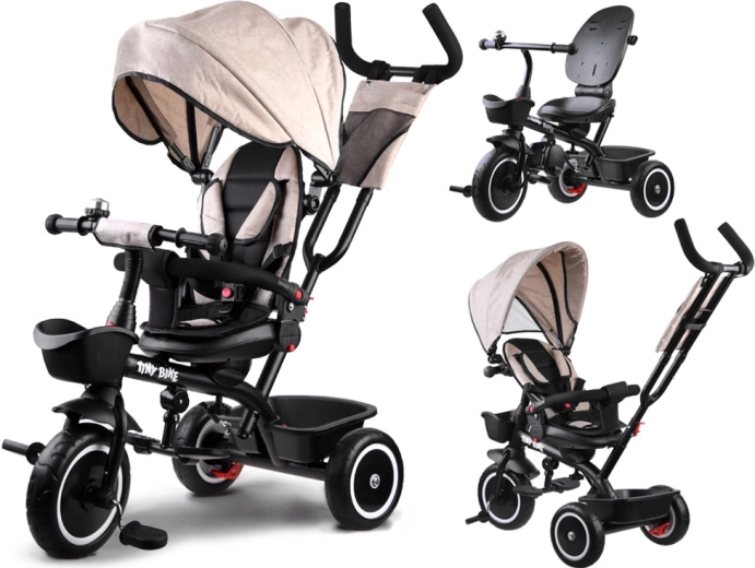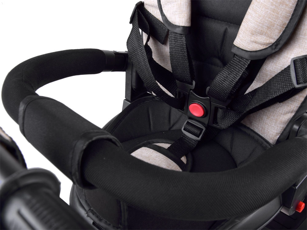 Šis daudzfunkcionālais 3-in-1 trīsritenis apvieno vecāku stumšanas režīmu, ērtu “ratiņu” režīmu un patstāvīgu trīsriteni pirmajiem braucieniem. Pagriežams sēdeklis ļauj skatīties uz vecāku vai braukšanas virzienā, jumtiņš ar ventilācijas sietiņu pasargā no saules, vēja un viegla lietus, nodrošinot patīkamu klimatu. 5 punktu jostas, mīksta noņemama barjera un viegli kopjams polsterēts pārvalks rūpējas par komfortu un drošību.