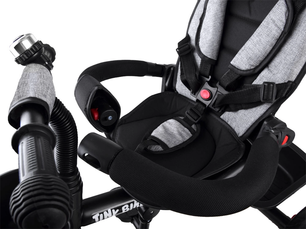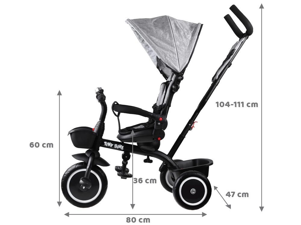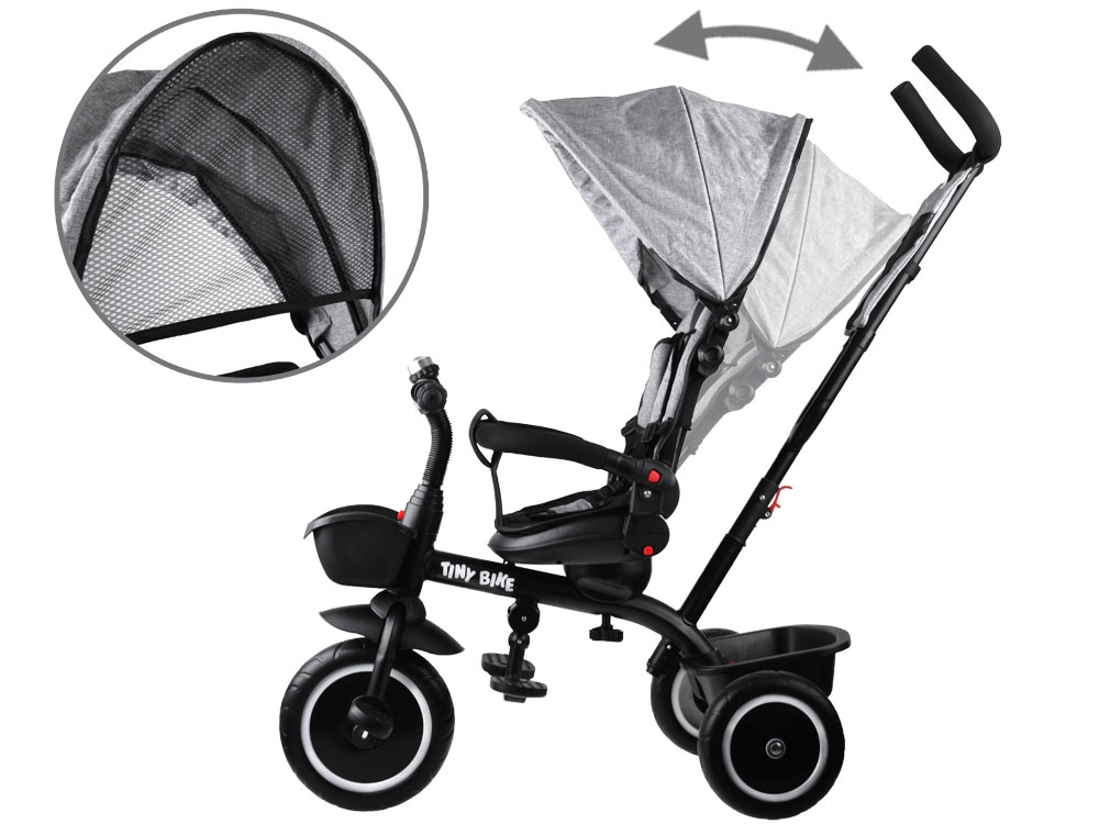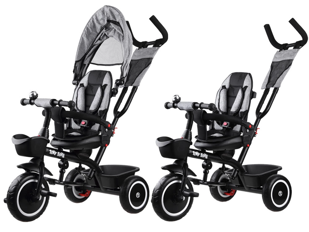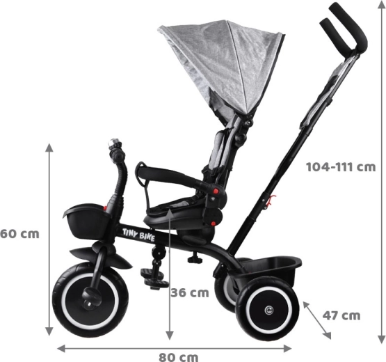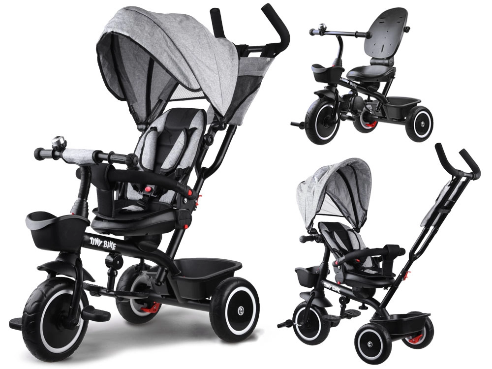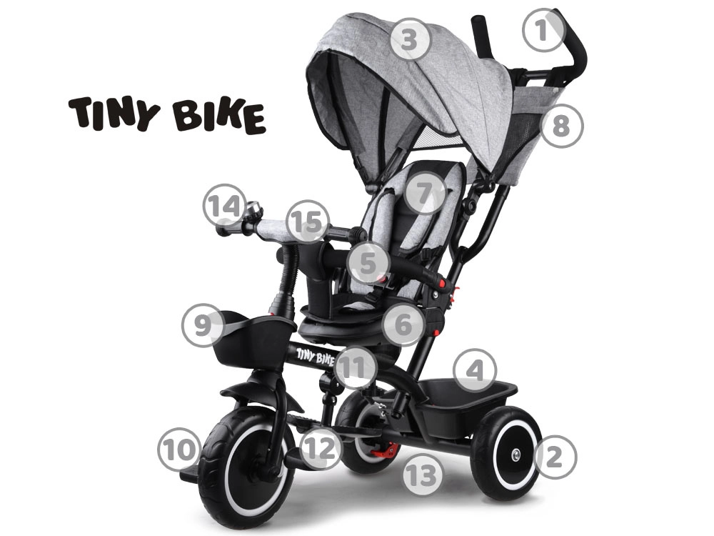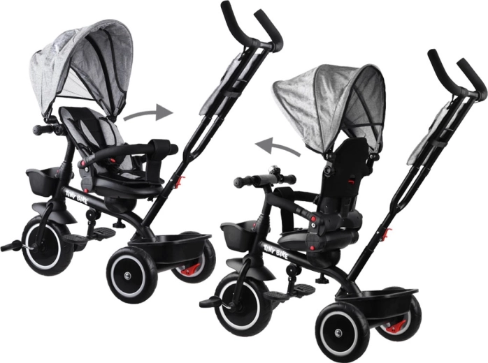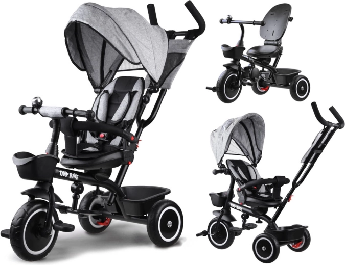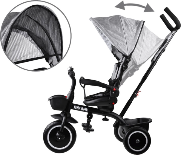 Multifunkcionālais bērnu trīsritenis 3 vienā TINY BIKE ar rotējošu sēdekli apvieno stumjamā trīsriteņa, ratiņu un patstāvīgi minama velosipēda funkcijas. Tas piedāvā 5 punktu drošības jostu, salokāmu saulessargu ar sietiņu, bezapkopes EVA riteņus, aizmugurējās bremzes un bagātīgu aprīkojumu ērtām un drošām pastaigām no 6 mēnešu vecuma līdz apmēram 5 gadiem.