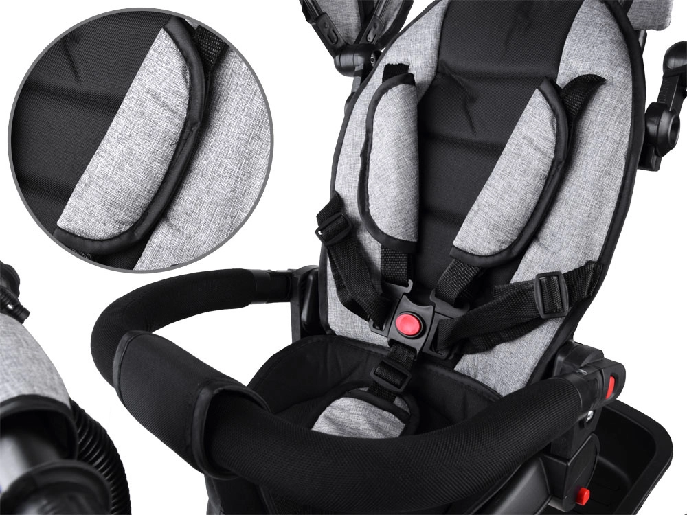 Trīsritenis 3 vienā aug kopā ar bērnu: no režīma ar vecāku vadību, caur pirmajiem minieniem līdz patstāvīgai braukšanai. Rotējošs un regulējams sēdeklis ar mīkstu pārklājumu, 5 punktu drošības jostas un mīkstināta drošības barjera nodrošina maksimālu drošību un komfortu. Salokāms jumtiņš ar aizmugurējo sietiņu vēdina un pasargā no saules, vēja un viegla lietus.