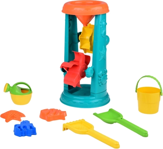 Bērnu smilšu komplekts ir rūpīgi veidots ar jūras dzīvnieku motīviem, piemēram, zivtiņām un astoņkājiem. Lielākais akcents ir 37 centimetru ūdens rats, kurā bērni var bērt smiltis vai liet ūdeni un vērot, kā griežas dubultie riteņi. Tas veicina loģiskās domāšanas un cēloņsakarību izpratnes attīstību.