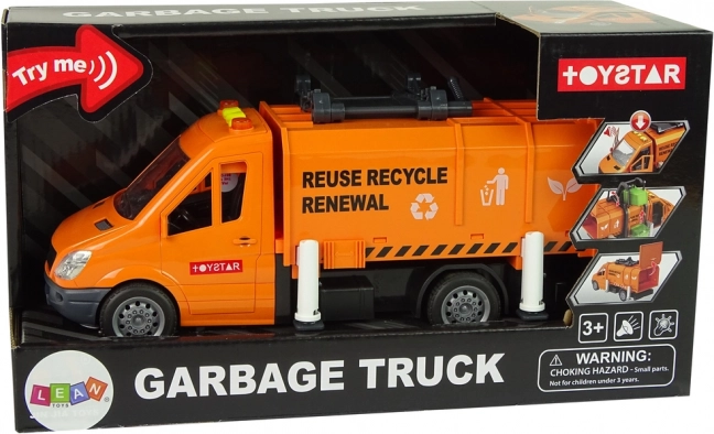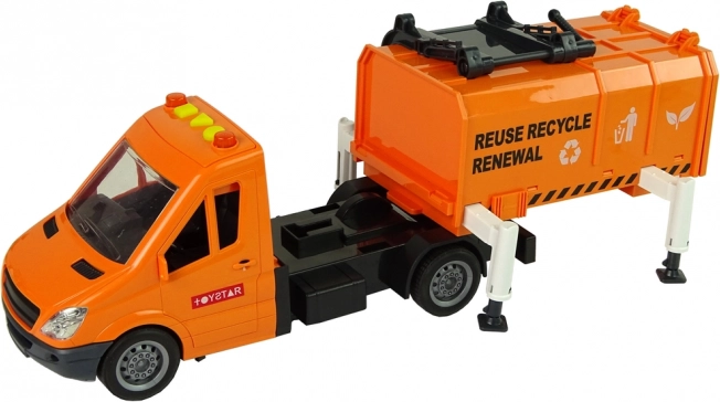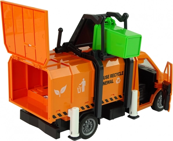 Oranžs atkritumu savākšanas auto ticami atdarina īstu atkritumu izvešanas transportu un pārvērš bērnu istabu mazā pārstrādes centrā. Pateicoties frikcijas piedziņai, pietiek auto pastumt, un tas pats uzsāk kustību. Atveramais konteiners nodrošina vieglu “atkritumu” izbēršanu, bet sānu pacēlājs ieber tvertņu saturu tieši virsbūvē.