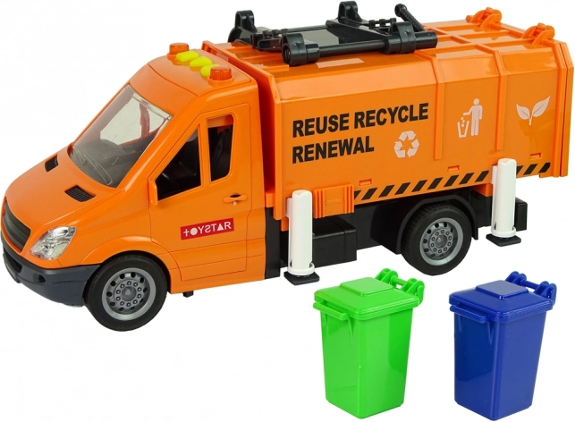 Uzdāviniet bērniem savu atkritumu savākšanas auto, ar kuru viņi apgūs šķirošanu un ekoloģijas pamatus. Oranžais modelis piedāvā frikcijas piedziņu, atveramu kravas kasti, pacelšanas mehānismu atkritumu tvertnēm un reālistiskus skaņas efektus (atkāpšanās, brīdinājums, iekraušana). Kvalitatīvs plastmasas izpildījums, divas tvertnes komplektā un barošana ar AG13 padara to par ideālu izglītojošu rotaļlietu bērniem no 3 gadu vecuma.