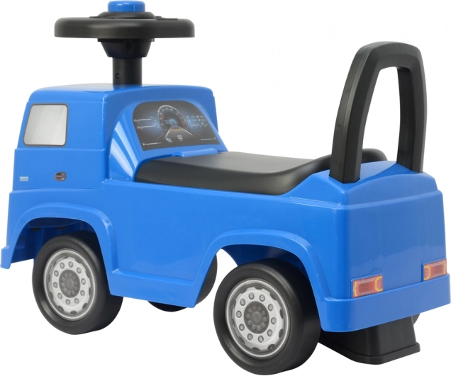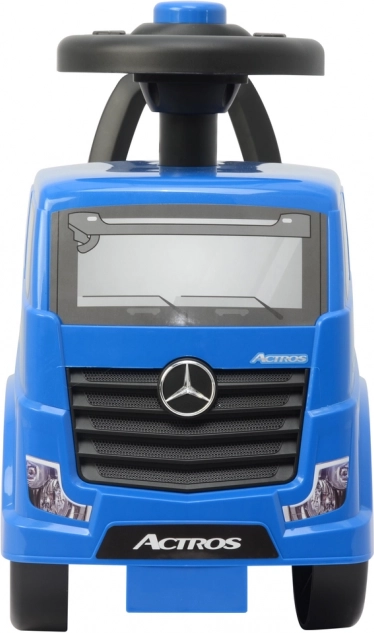 Zilais atspēriena braucamais MERCEDES Actros ir ideāls bērniem, kuri prot patstāvīgi atspiesties ar kājiņām. Nelielais svars atvieglo lietošanu gan vecākiem, gan bērniem, bet stingrā konstrukcija nodrošina drošu braukšanu pa gludu virsmu mājās, pagalmā un dārzā. Uzmanība detaļām – diski, priekšējie lukturi un reste – rada autentisku kravas auto izskatu.