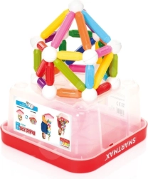 Šis paplašinātais SMARTMAX konteiners piedāvā 70 izturīgas magnētiskās detaļas: 38 īsās nūjiņas, 12 garās nūjiņas un 20 metāla lodītes. Detaļas ir lielas, izturīgas un drošas mazajiem bērniem – ideāli piemērotas pirmajiem magnētiskajiem atklājumiem un iespaidīgām būvēm. Caurspīdīgo plastmasas kasti ar stingru vāku var izmantot no abām pusēm kā būvēšanas pamatni.