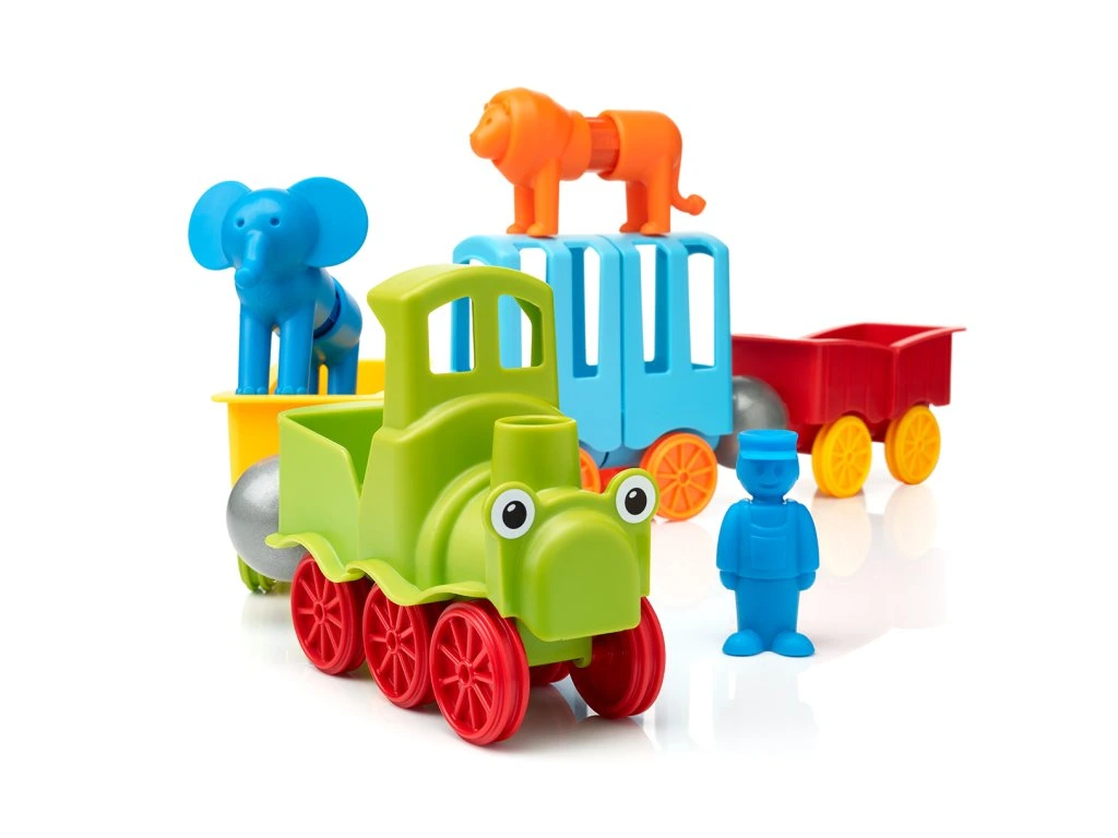 Bērni saliks lokomotīvi un trīs vagonus, pievienos divus trīsdaļīgus dzīvnieciņus un vilciena vadītāja figūriņu. Dzīvnieku daļas var brīvi kombinēt – rodas gan īsti, gan fantāzijas tēli, kas attīsta radošo domāšanu un acu–roku koordināciju.