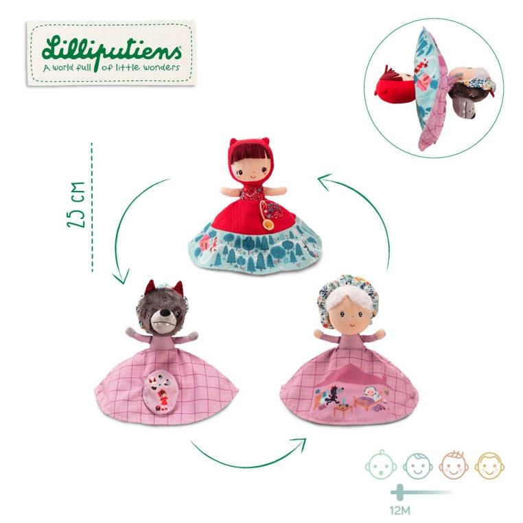 Iemīliet leļļu cimdu, kas apvieno trīs tēlus vienā rotaļlietā – Sarkano cepurīti, Vecmāmiņu un Vilku. Pietiek tikai pagriezt leļļu cimdu, un parādās dažādi populārās pasakas varoņi. Leļļu cimds ir izgatavots no mīksta materiāla, kas ir patīkams manipulācijai un nodrošina drošas rotaļas, pateicoties maigi apstrādātai virsmai.