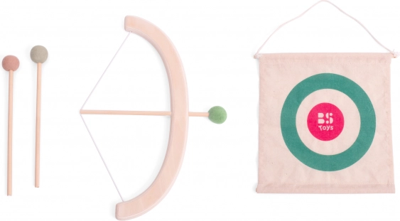 Iepakojumā ir iekļauts koka loks ar izmēriem 40 × 13 cm, trīs bultas 26,5 cm garumā un auduma mērķis 26 × 29,5 cm. Izstrādājums ir veidots tā, lai būtu drošs un vienlaikus sniegtu īstu loka šaušanas pieredzi. Uzmanību: Nav piemērots bērniem līdz 36 mēnešu vecumam mazo detaļu dēļ, kuras var ieelpot vai norīt. Izmantojiet tikai iepakojumā iekļautās bultas un ievērojiet drošības norādījumus.