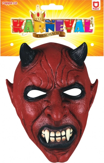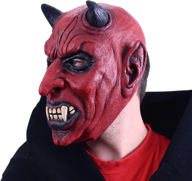 Ļoti detalizēta lateksa maska ar reālistiskām velna iezīmēm, tostarp melniem ragiem un asiem zobiem, kas piešķir biedējošu autentiskumu.