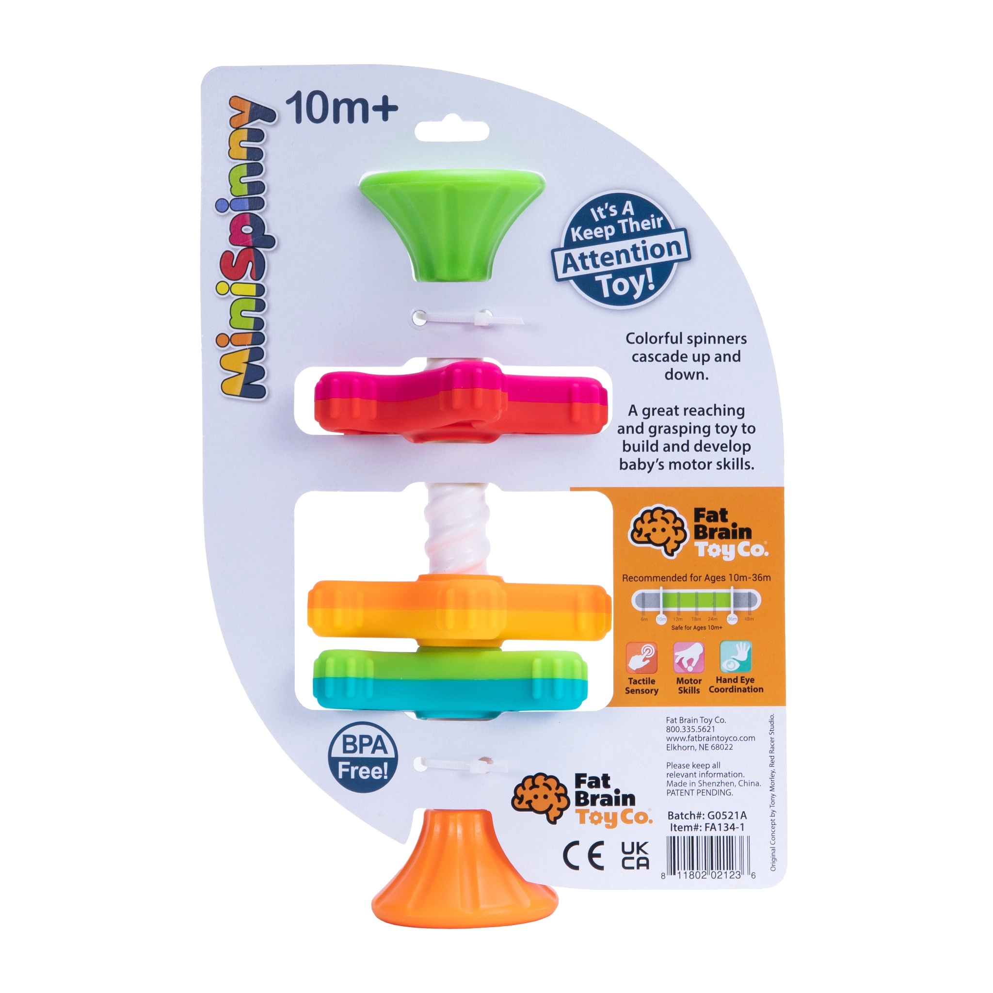 Pateicoties piesūcekņam, rotaļlietu viegli piestiprināt pie galda, krēsliņa paplātes vai loga – nekas nepazudīs, un detaļas turas kopā. MiniSpinny ir lieliska mājās, ceļā un arī vannas istabā. Drošs plastmasas materiāls bez BPA un ftalātiem nodrošina bezrūpīgu rotaļu.