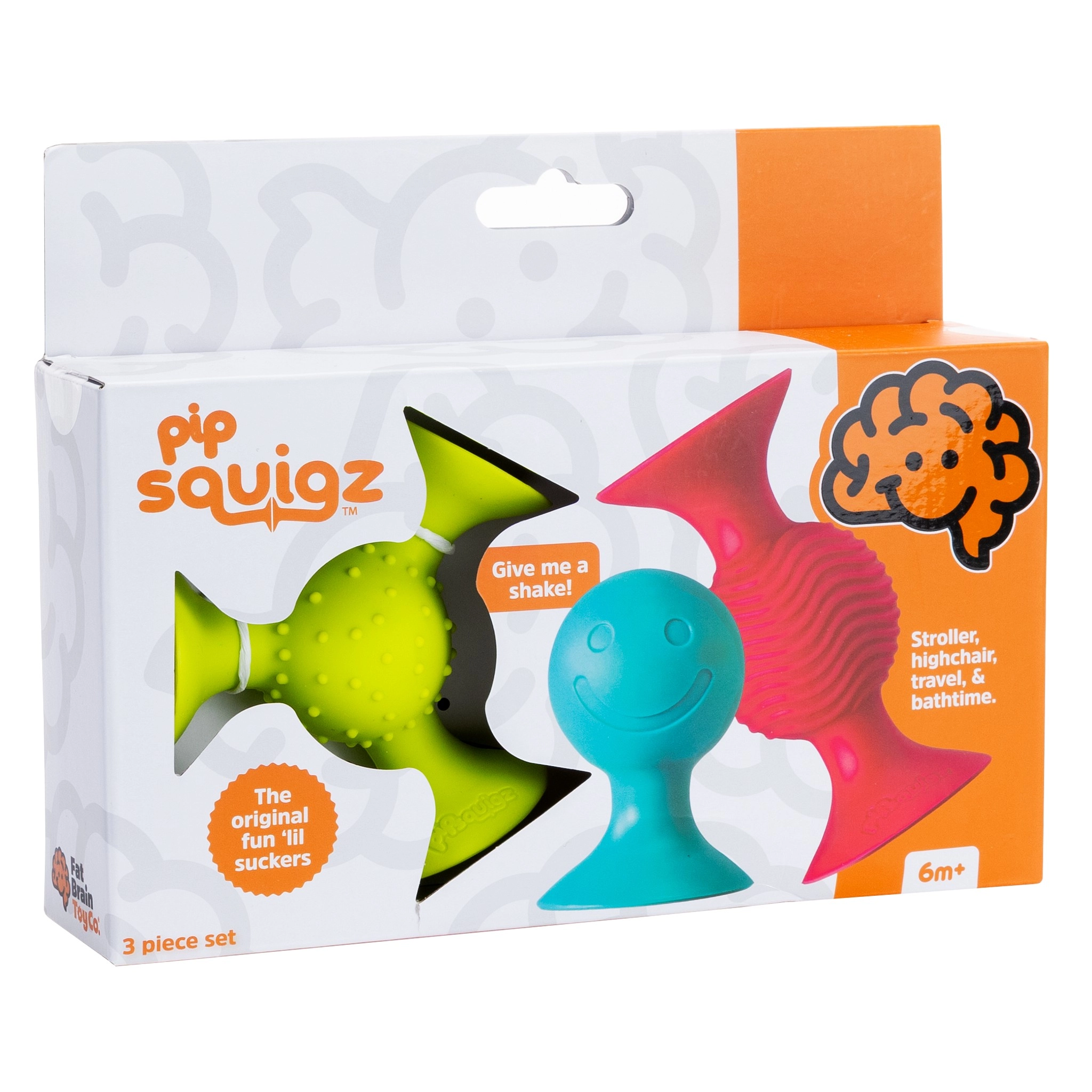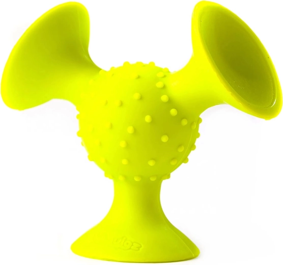 pipSquigz komplekts (3 gab.) sniedz bērniem bezgalīgas rotaļu iespējas mājās un ceļojumos. Katra detaļa ir izgatavota no kvalitatīva, mīksta silikona un aprīkota ar piesūcekņiem, kas droši turas pie gludām virsmām – uz barošanas krēsliņa, vannā vai pat pie loga. Grabējošie un teksturētie elementi aicina satvert un mīcīt, dabiski attīstot motoriku un maņas.
