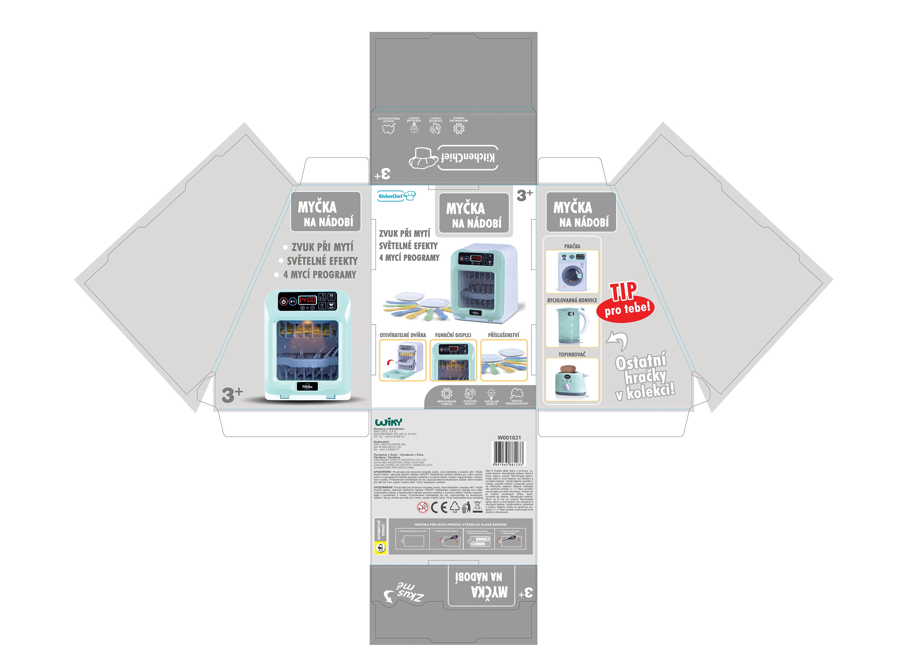 Izvēlies no 4 mazgāšanas programmām vai iestati savu laiku pēc vajadzības. Mašīna gatava lietošanai uzreiz pēc izsaiņošanas – 2× AAA baterijas ir iekļautas komplektā. Perfekta dāvana, kas izklaidē un māca kārtību virtuvītē.