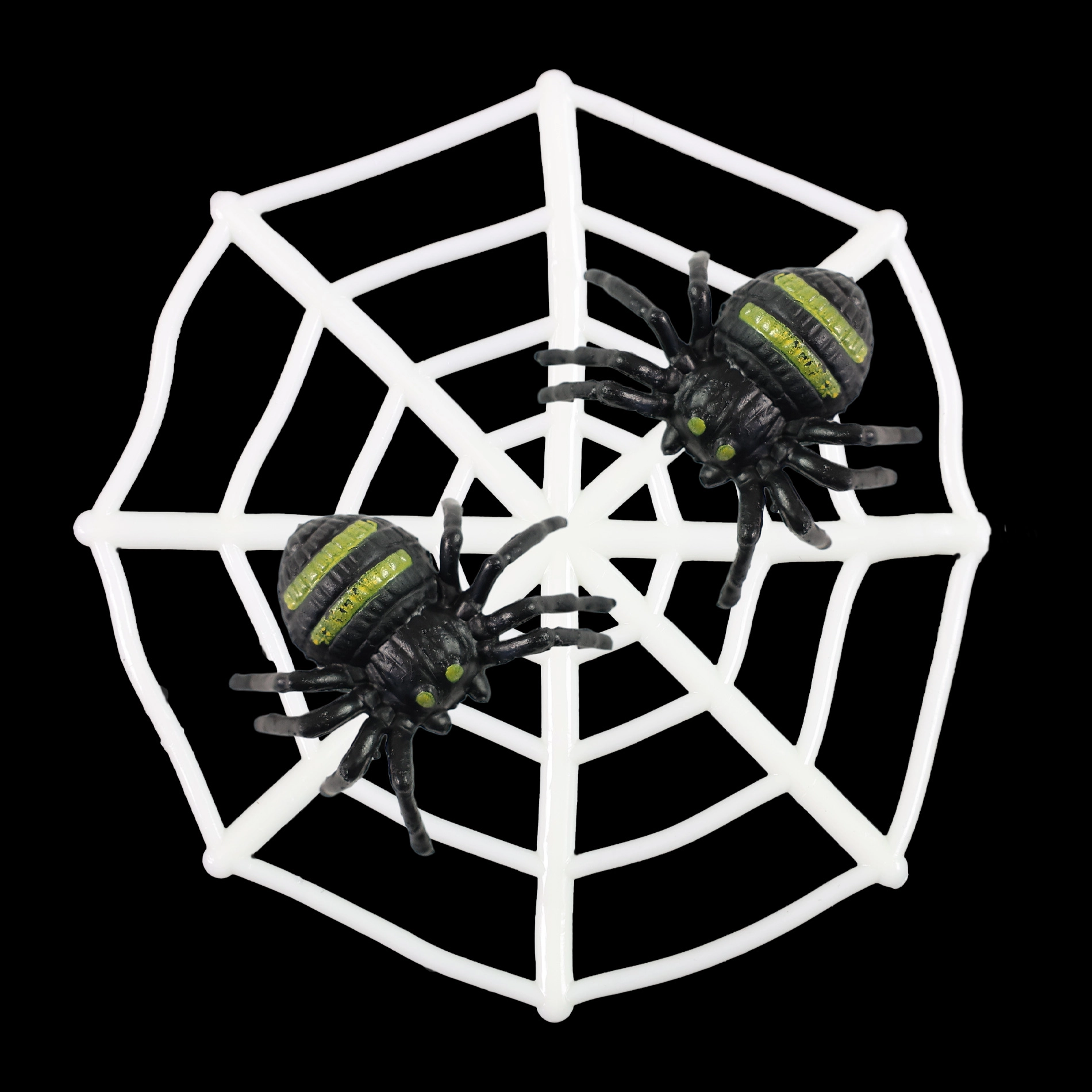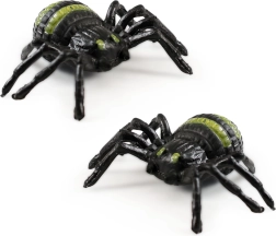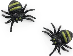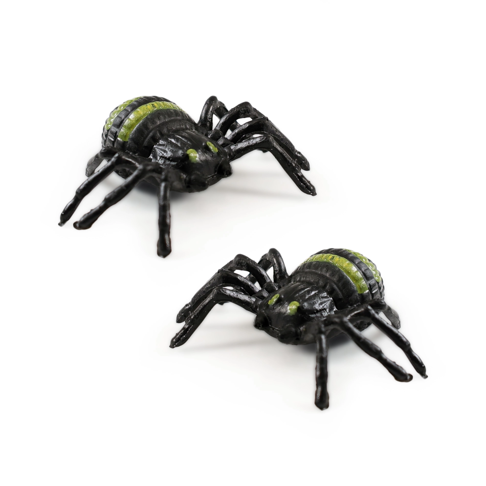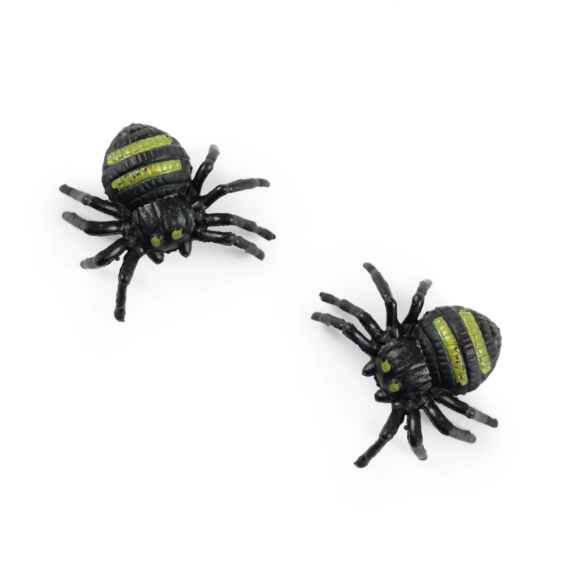 Divi plastmasas zirnekļi ar melniem ķermeņiem un zaļām svītrām uz muguras – ideāli dekorācijām vai kā Helovīna aksesuāri.