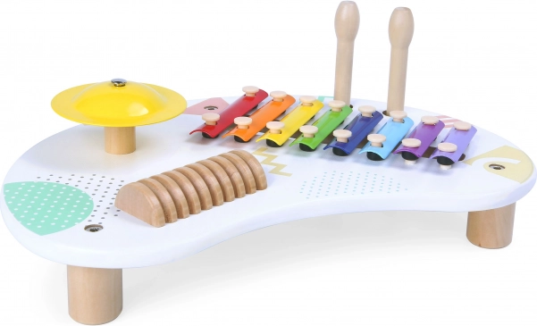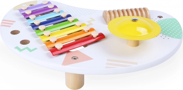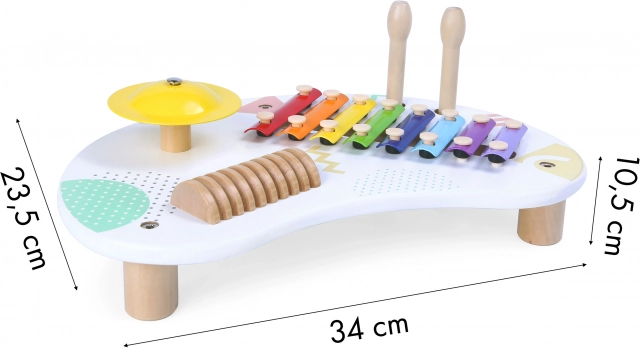 Bērnu mūzikas galds ECOTOYS ir lieliska izvēle mazajiem mūziķiem. Tas piedāvā daudzveidīgu 8 toņu ksilofonu, skanīgu šķīvi un koka skrāpi ritmiskajiem pavadījumiem. Pateicoties divām koka nūjiņām, bērni viegli izmēģinās dažādas skaņu krāsas un vingrinās acu–roku koordināciju.