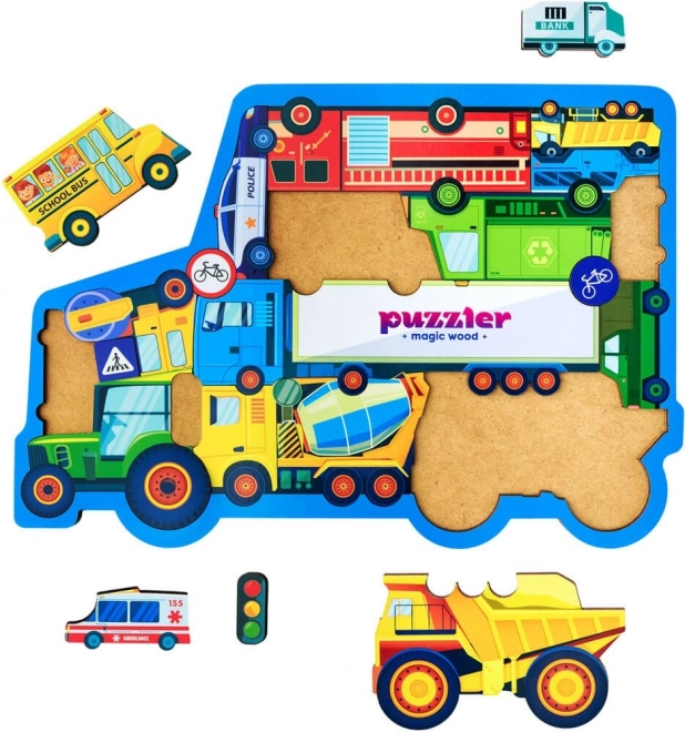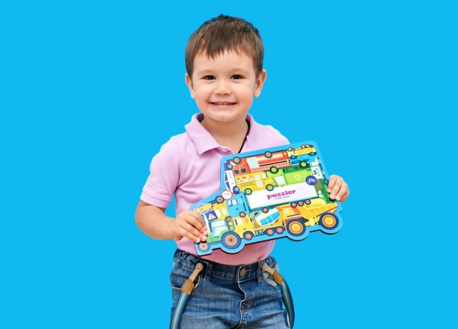 Saliktās puzles izmērs ir apmēram 29 × 20,5 cm – tieši piemērots bērnu rokām un mājas spēļu galdam. Puzle ir lieliska izvēle bērniem, kuri interesējas par dažāda veida automašīnām, vienlaikus attīstot roku–acu koordināciju un kognitīvās spējas.