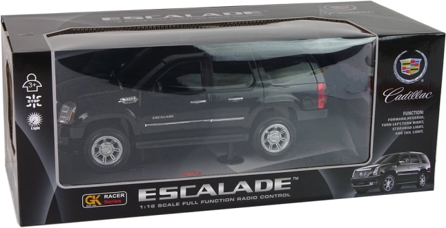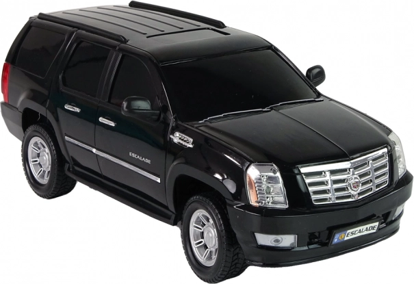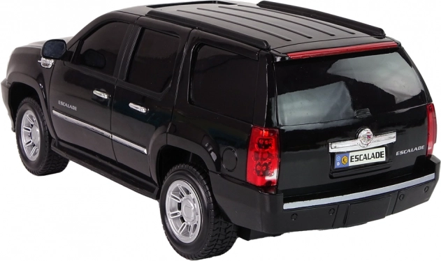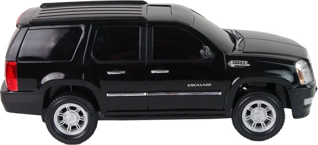 Ikoniskā CADILLAC ESCALADE precīzs atveidojums mērogā 1:16 ar elegantām melnām krāsām un izstrādātiem virsbūves elementiem.