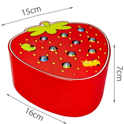 Izklaidējoša koka spēle zemenes formā, kur bērni ar magnētisku nūjiņu ķer krāsainus tārpiņus, kas paslēpti caurumiņos, un liek tos atpakaļ. Attīsta sīko motoriku, roku–acu koordināciju un koncentrēšanos. Droša izpilde no kvalitatīva koka un košas krāsas aicina spēlēties atkal un atkal.